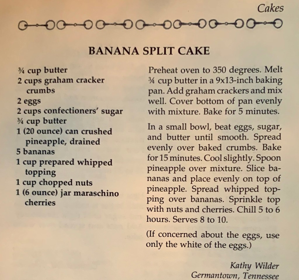 As a nod to all moms enjoying extra baking time this spring, I am sharing my mother’s famed Banana Split Cake, which has the consistency of a banana pudding with a crumbly crust.